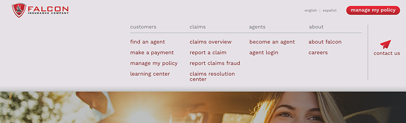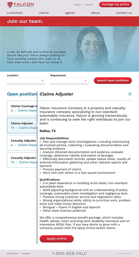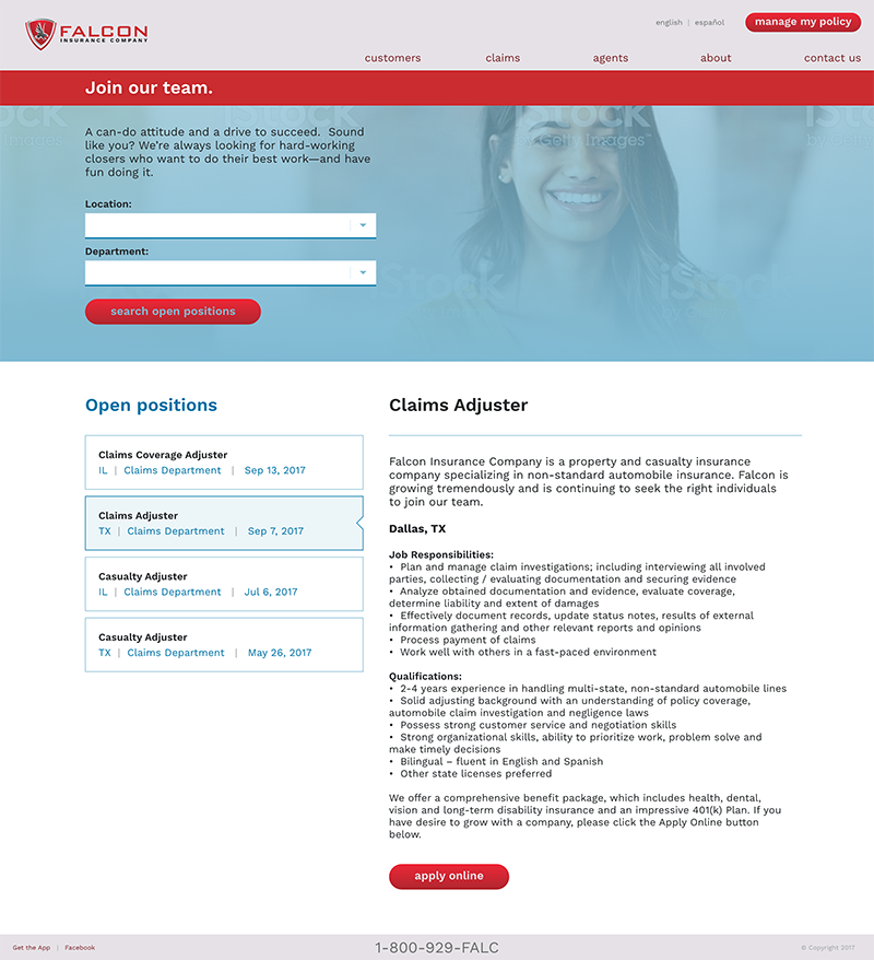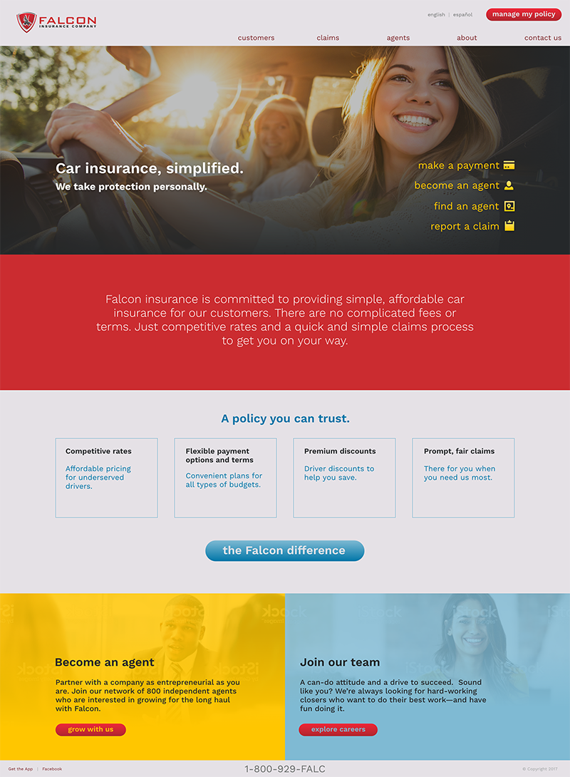 Falcon Insurance Group wanted to update their web presence to better reflect an updated business focus. Moving from insurance startup to improving both their service and image within the industry. Major goals were connecting with talented insurance agents and helping customers more easily file claims online.